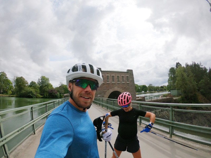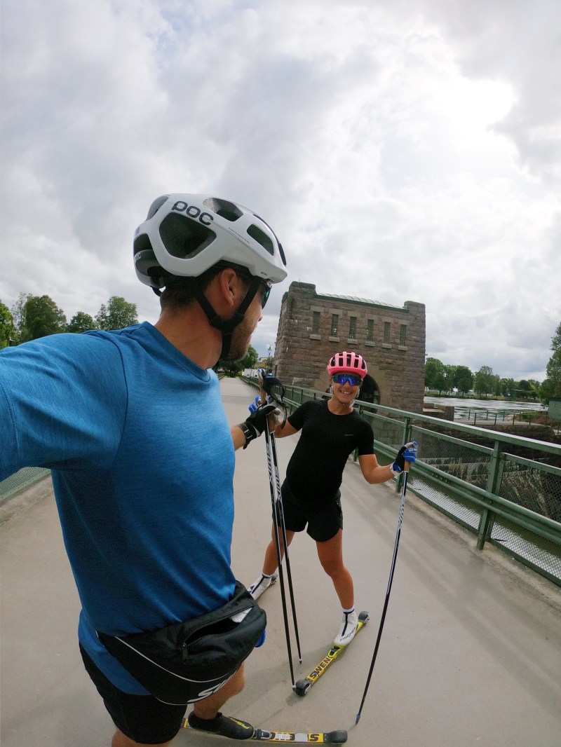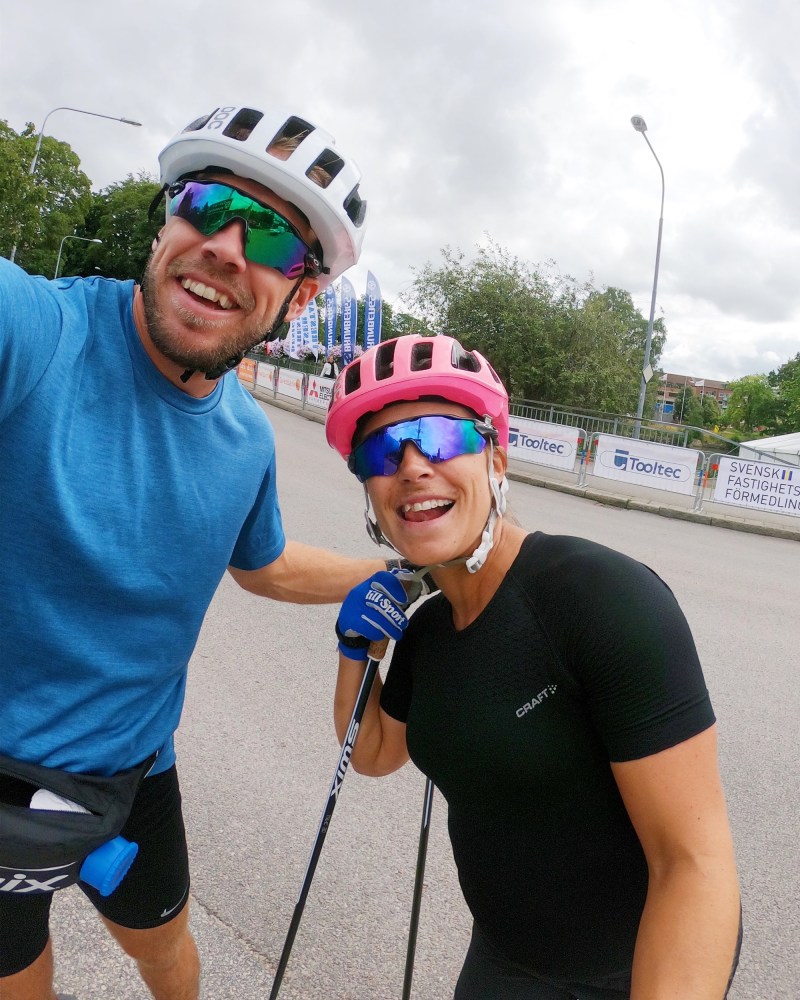 Fortsatte fylla på med energi (trots spykänslan av att fylla upp magen..) och plötsligt hade vi bara någon kilometer kvar! Så jäkla skoj! Vi såg färre och färre andra åkare och när det var knappt två kilometer kvar och jag i min hjärna började tänka spurt stoppar jag staven i hålighet på en bro och bryter staven. Så. Jäkla. Irriterande. Får Emil stav som är cirka 25 cm längre än min egen… Men den har i alla fall en spets. Så vi stakar lite halta mot mål och går i mål som första dam i motionsklassen på 2h och 27 minuter. Två och en halv timme med grymt teamwork och en kropp som återigen överraskar på mig!